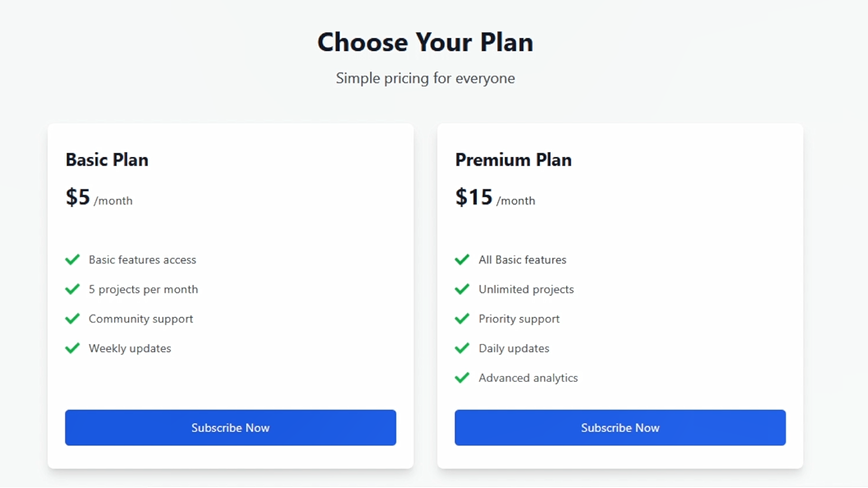 Complete Stripe Subscription/Recurring Code (React + Tailwind CSS)